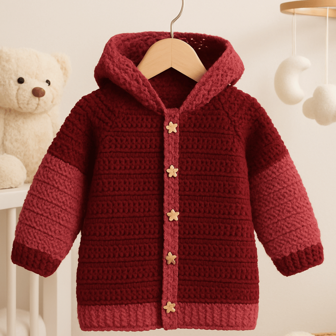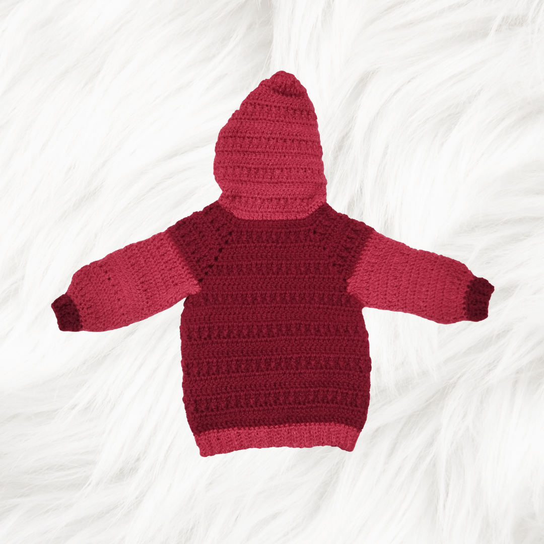 Handmade Crochet Baby Hoodie – Dual-Tone Maroon & Rose Pink with Hood – Soft & Cozy – Age 3-6 Months