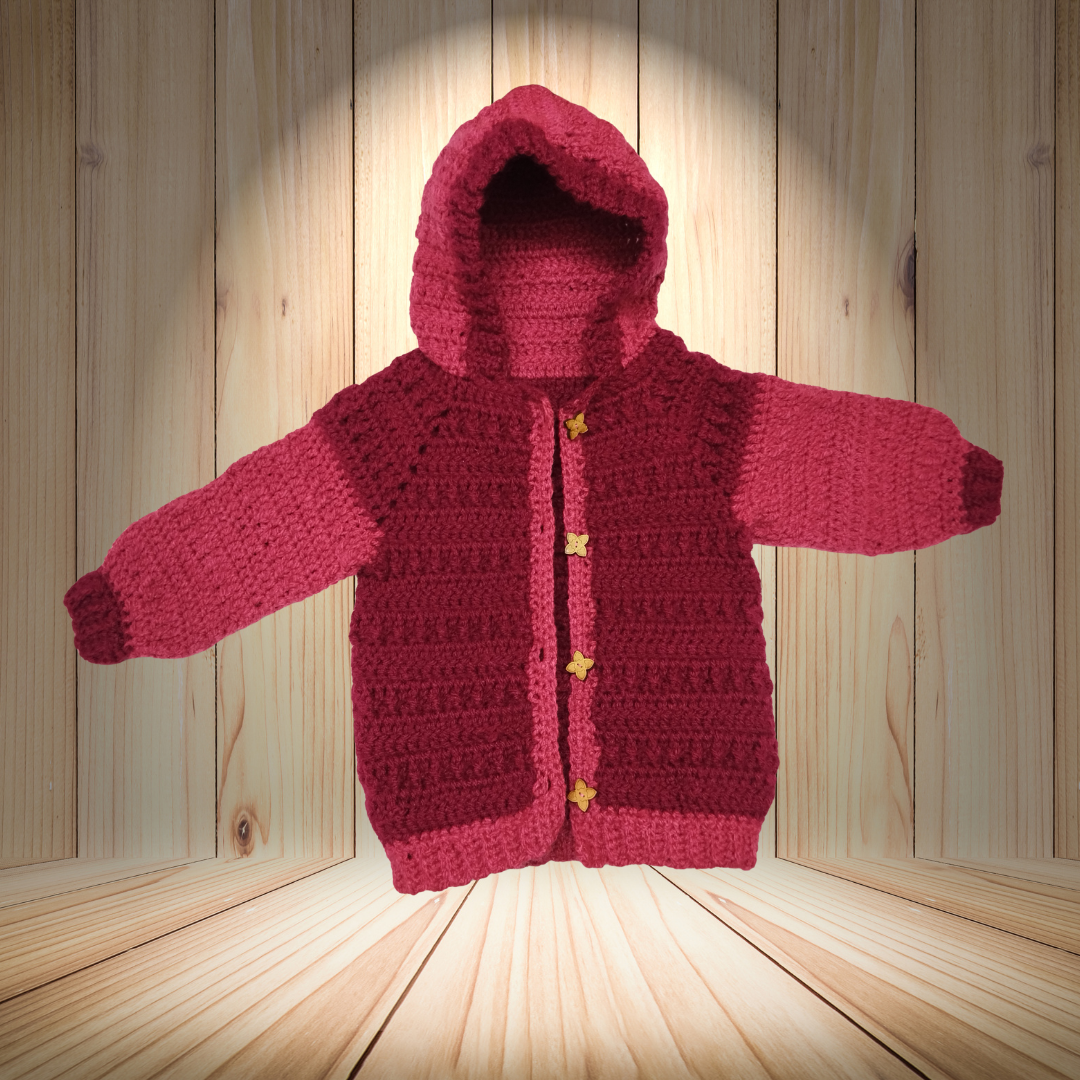 This cozy, handmade crochet hoodie is crafted with soft acrylic yarn in rich maroon and rose pink tones. Designed for warmth and comfort, it features a stylish hood, full sleeves, and a snug fit—perfect for chilly days.