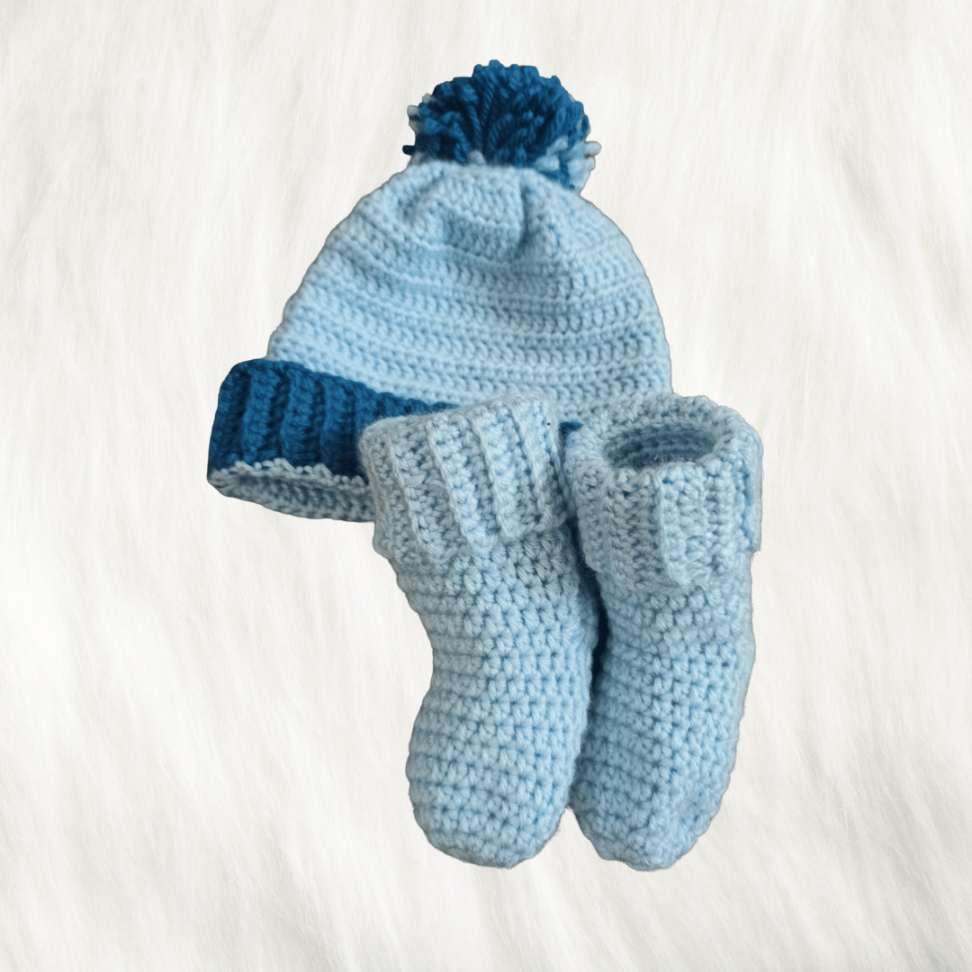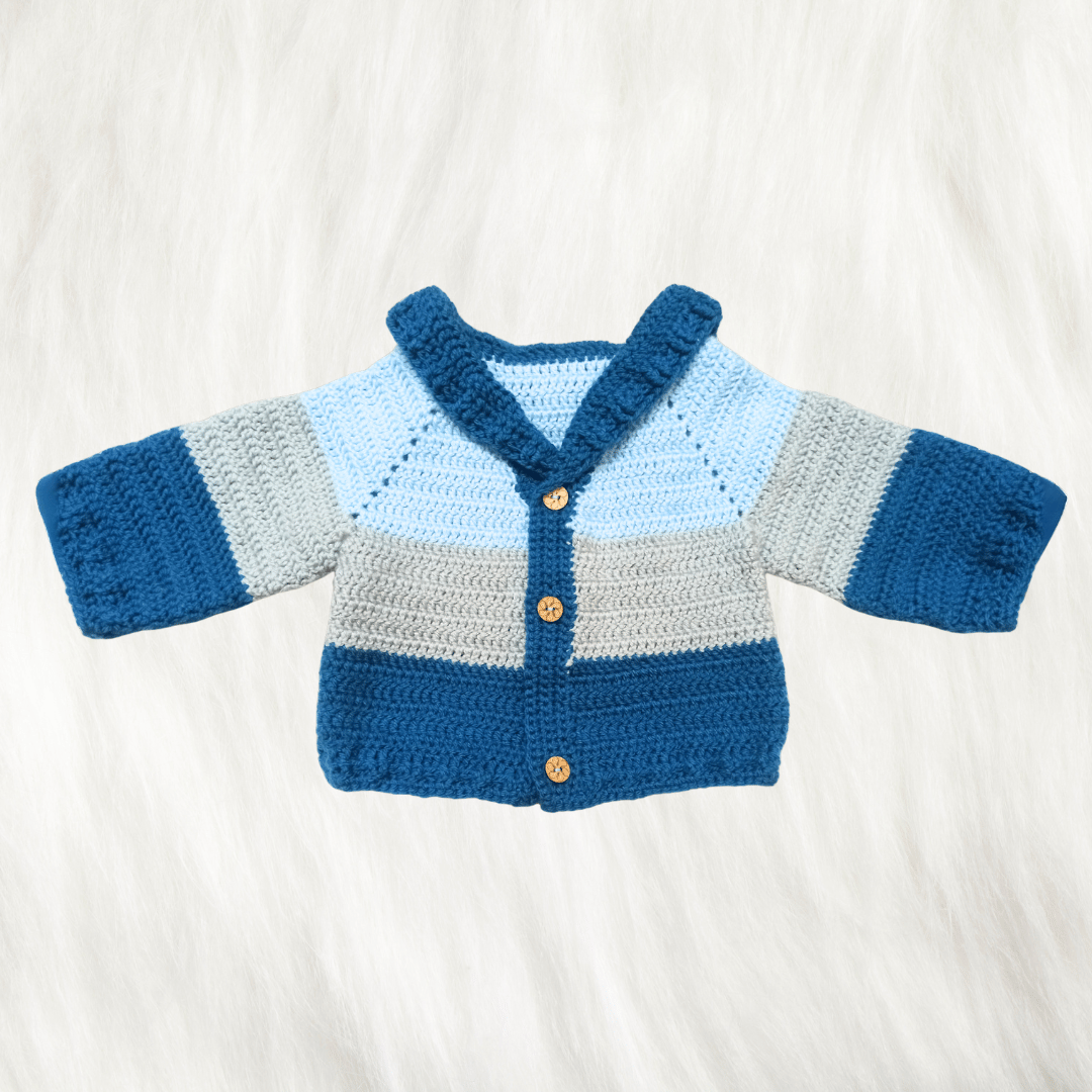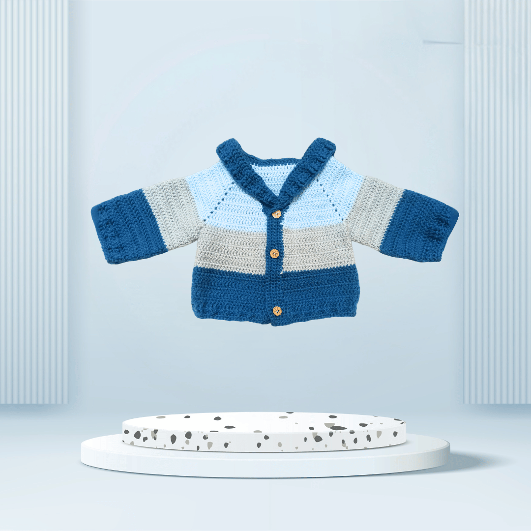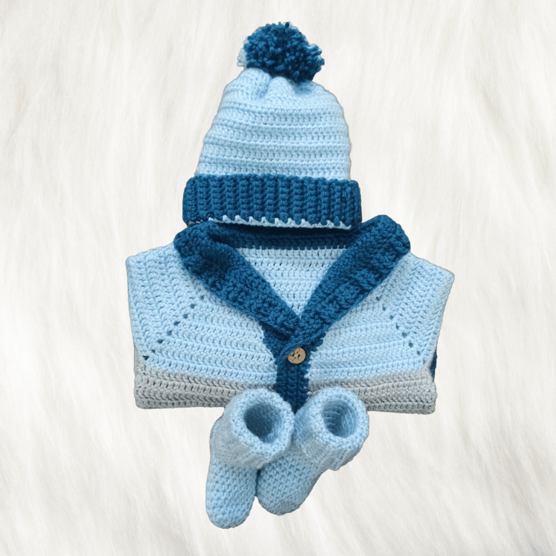 Handmade Crochet Baby Sweater Combo (Sweater, Cap & Socks/Booties) – Sky Blue & Navy | New born, 0-3 Months