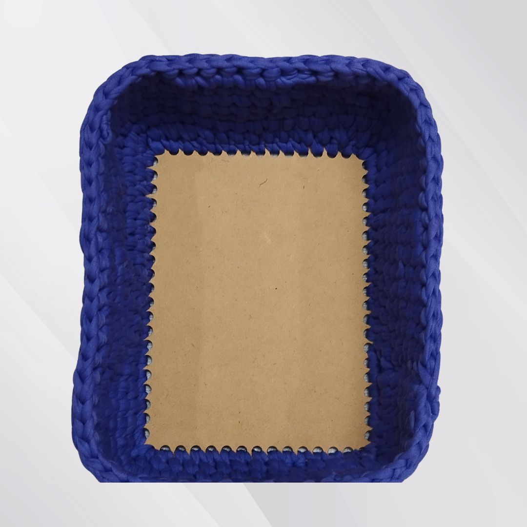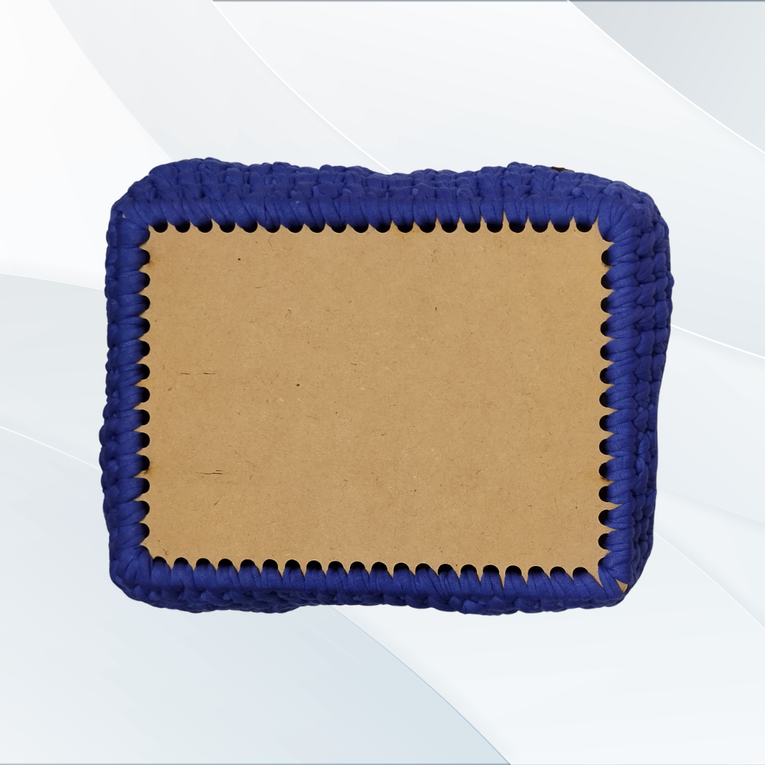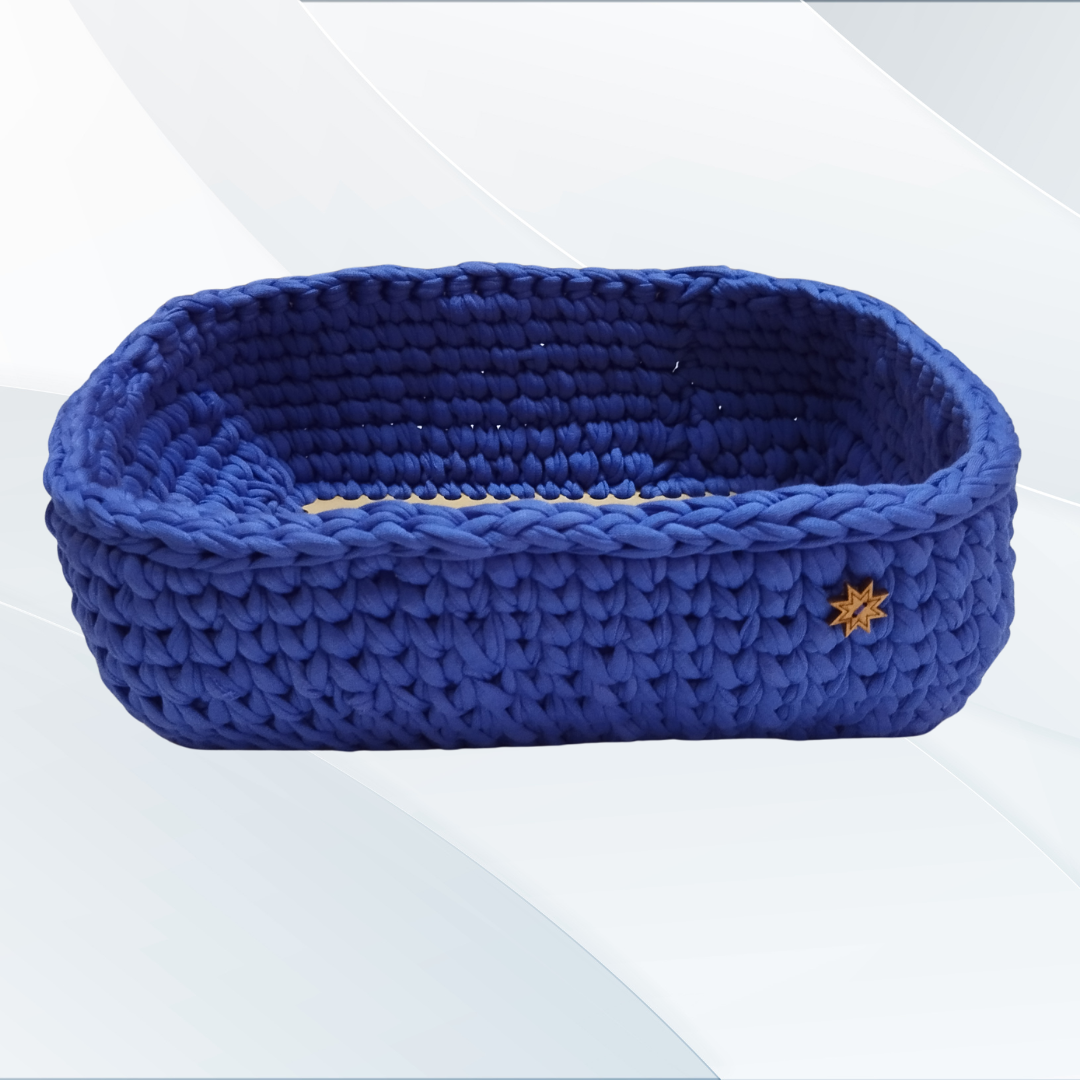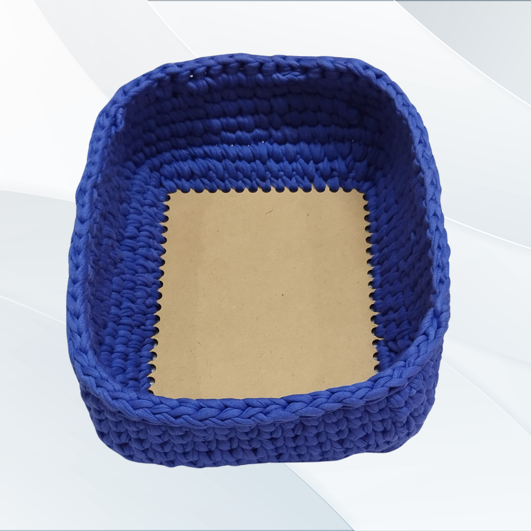 Handcrafted Deep Blue Crochet Basket – Rectangular Organizer with MDF Wooden Base, Bring warmth, function, and charm into your space with this handcrafted crochet basket, lovingly made using chunky recycled cotton yarn in a stunning royal blue tone. Each basket is skillfully woven by hand Color: Royal Blue