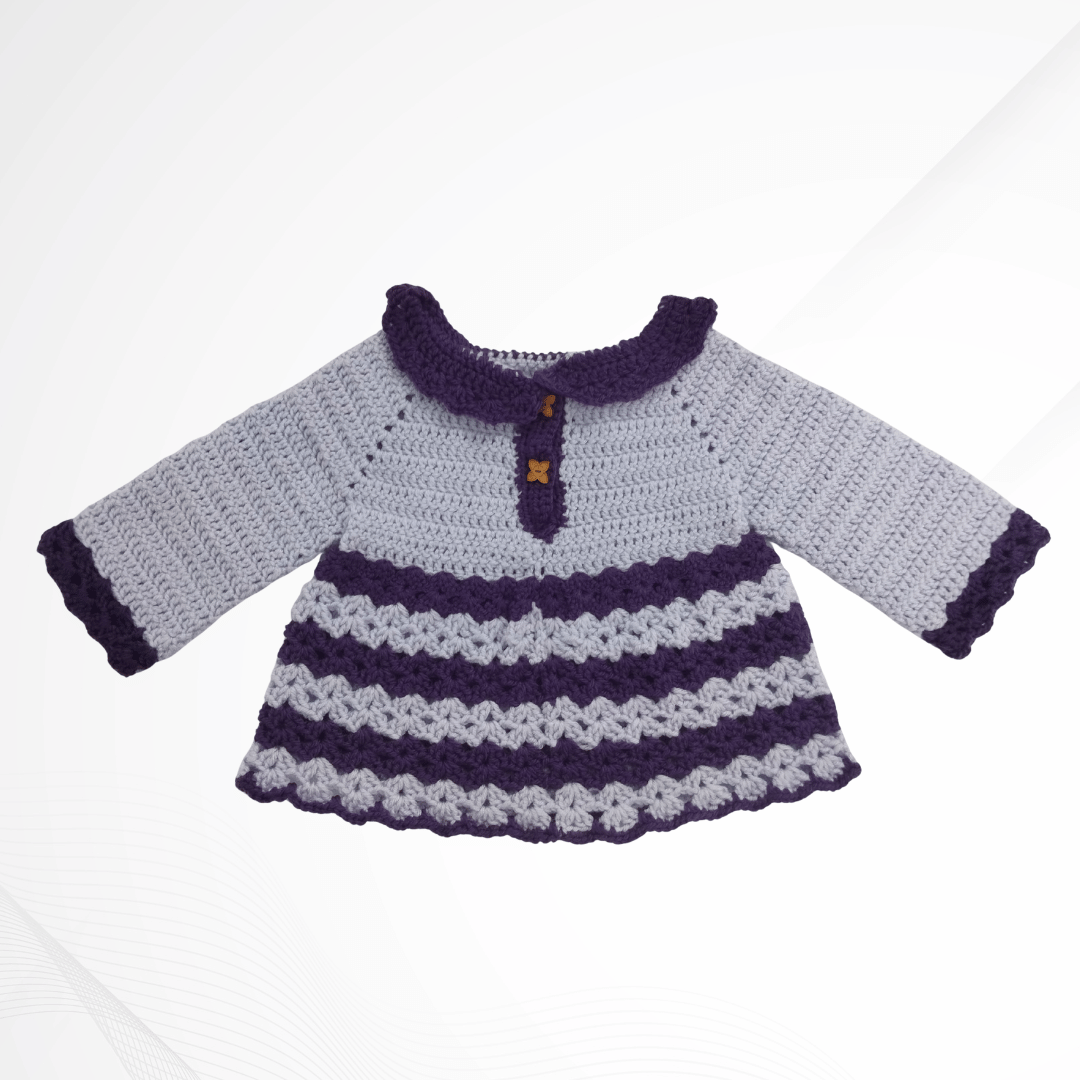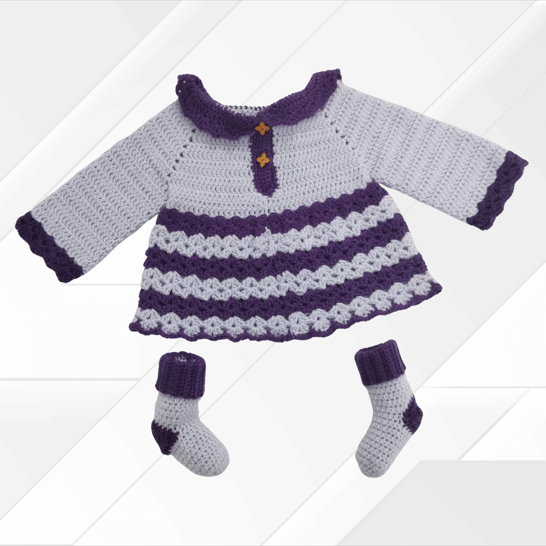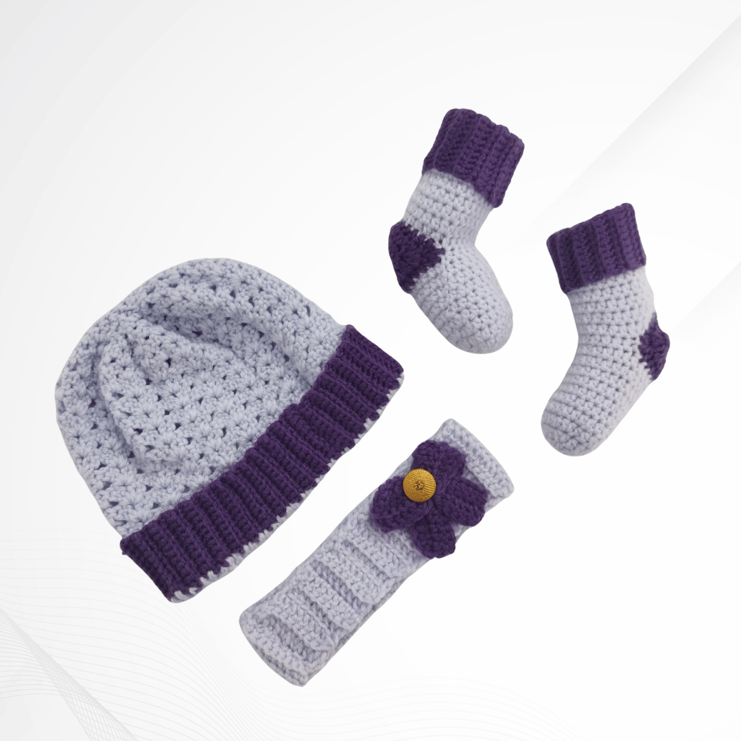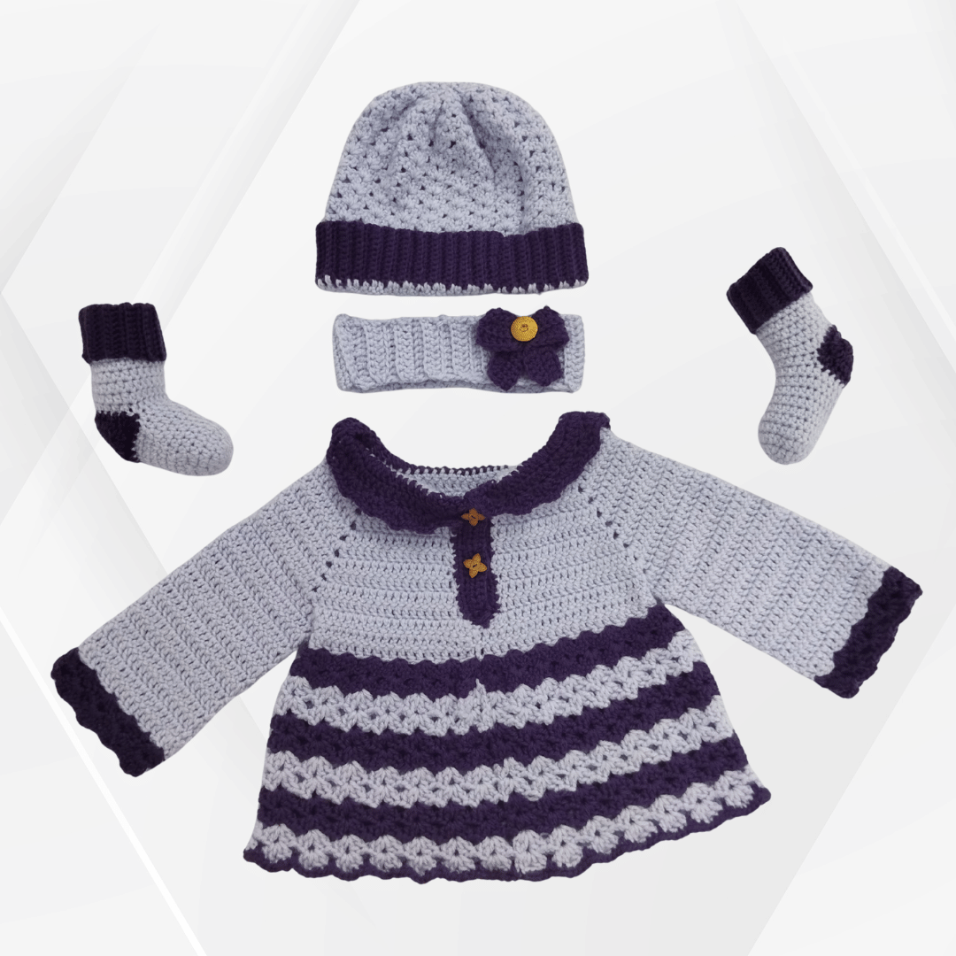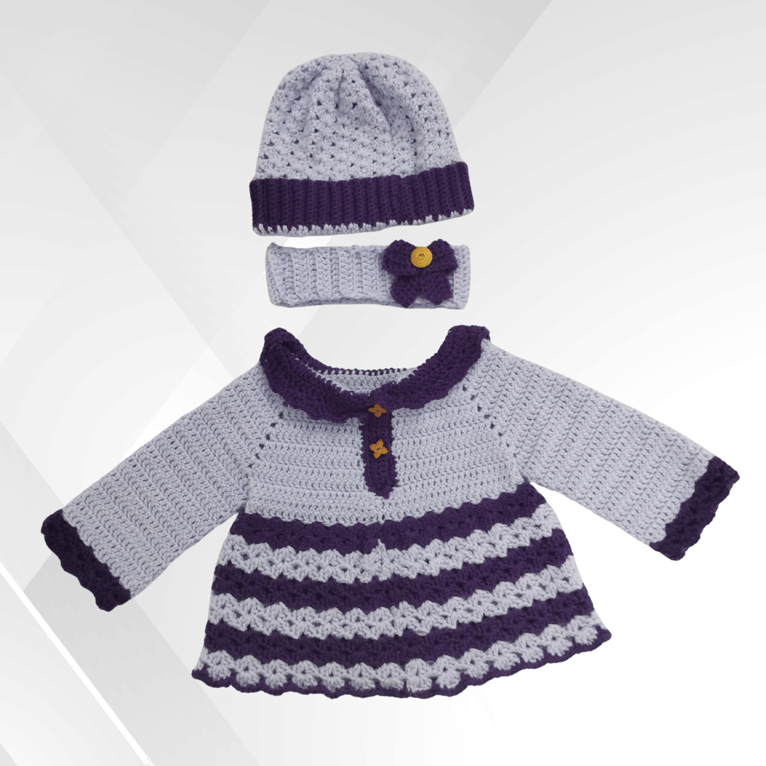 Dress your precious little one in warmth and whimsy with this beautifully handcrafted Handmade Baby Blossom Set. Designed in soft lavender with deep plum accents, this cozy four-piece ensemble includes a dress, hat, headband, and socks – Perfect for keeping your baby stylish and snug.